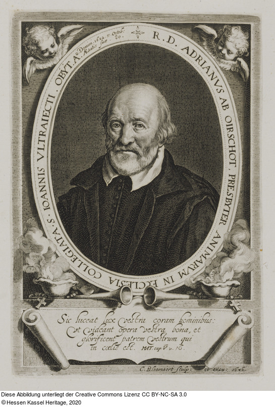 Beschriftungen: in der Platte: R. D. ADRIANVS AB OIRSCHOT, PRESBYTER ANIMARVM IN ECCLESIA COLLEGIATA.S.IOANNIS VLTRAIECTI. OBYT. A°. Domini. 1622. 11. Octob: Ætatis suæ. 50.; Sic luceat lux ... in cælis est. MAT. cap: V. v. 16.; C. Bloemaert sculp. et excu: 1626.;