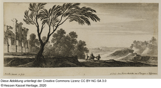 Primäre Ikonographie: 25H114 Hügellandschaft Primäre Ikonographie: 43A422 Triumphbogen Primäre Ikonographie: 48C149 Ruine eines Gebäudes Sekundäre Ikonographie: 25G3 Bäume Primäre Ikonographie: 46C53 Wanderer Primäre Ikonographie: 46C131 auf einem Pferd, Esel oder Maultier reiten; Reiter(in) |