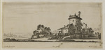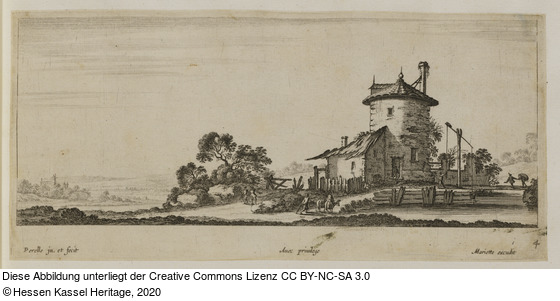 Werktitel: Landschaft mit Haus, Turm und wasserschöpfendem Mann an einem Fluss