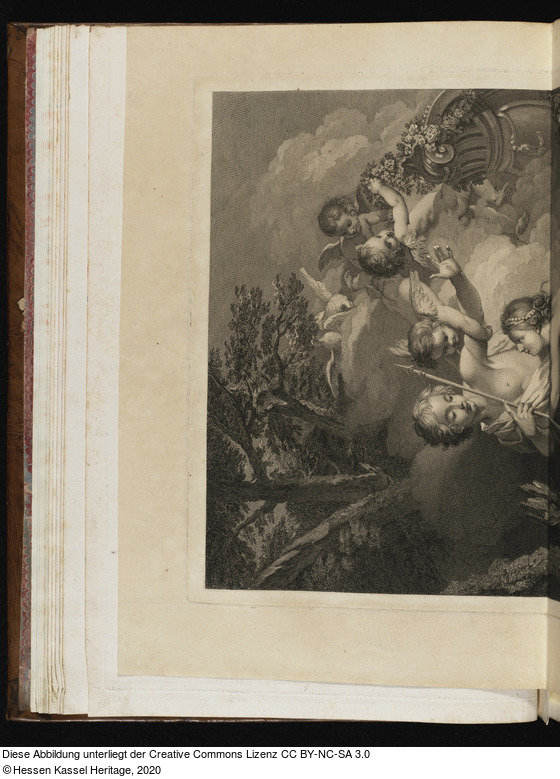 Beschriftungen: in der Platte: Jaurat pinxit; R. Gaillard Sculp.; VENUS ET ADONIS; Le Tableau Original est dans le Cabinet de Monseigneur de Damery, Chevalier de l'ordre Royal Militaire de S. Louis. Baisiez Scrip.; à Paris chez Gaillard rue S. Jacques, au dessus des Jacobins, entre un Perruqier et une Lingere.;