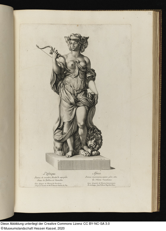 in der Platte: Gir. Audran sculps. 1681.; L'Afrique. Statue de marbre, haulte de sept pieds. Dans les Jardins de Versailles. Par GAspard de Marcy, de Cambray. D'apres le dessein de M.r Le Brun I.er Peintre du Roy.; Africa. Statua marmorea, septem pedes alta. In Hortis V;