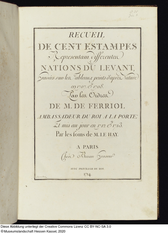 in der Platte: RECUEIL DE CENT ESTAMPES Representant differentes NATIONS DU LEVANT, Gravées sur les Tableaux peints d'après Nature en 1707 et 1708. Par les Ordres DE M. DE FERRIOL AMBASSADEUR DU ROI A LA PORTE; Et mis au jour en 1712 et 1713. Par les soins de M. LE HAY.;