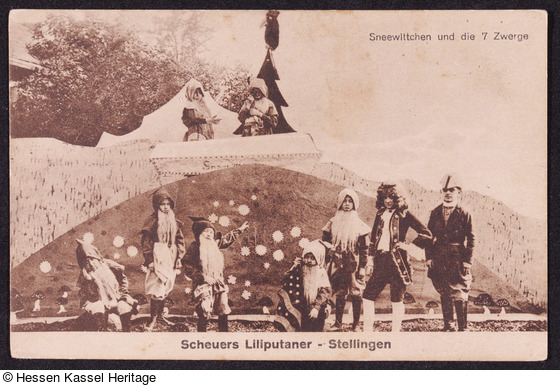 Vorderseite: Schneewittchen und die 7 Zwerge. Scheuers Liliputaner - Stellingen.; Rückseite: Verlag Hugo Schlünsen, Altona, Waterloostr. 6; B 89.;