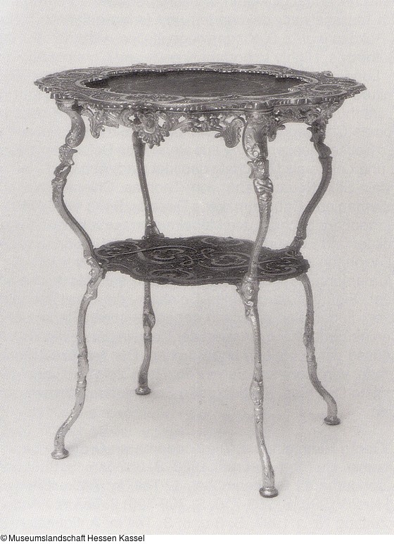 Material / Technik: Eisenguß, Tischbeine und Zarge ursprünglich geschwärzt, später silberbronziert, die beiden Platten geschliffen, Oberflächen vernickelt, in vielen Teilen gegossen, verschraubt.