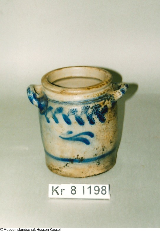Leicht nach innen gewölbter Standboden mit exzentrischen Abschneidespuren. Zunächst konischer, nach oben leicht verjüngter, dann leicht gebauchter Gefäßkörper mit abgeplattetem, leicht ausschwingendem Lippenrand. Schulterständige, gegenständig horizontal stumpf angarnierte Bandhenkel, auf je einer Seite glatt verstrichen. Ein Henkel mit Verarbeitungsfehlern. Bauchung oben und unten durch umlaufendes Steg-Kehlung-Band abgesetzt, kobaltblau ausgemalt. Henkel blau umrahmt und mit Strichmuster und linearem Ornament. Salzglasur mnit beige-grauer Farbwirkung, blaue Farbe zum Teil ausgelaufen. Auf Wandung gegenüberliegend Zickzacklinie in Kobaltblau, darunter lineares Ornament.