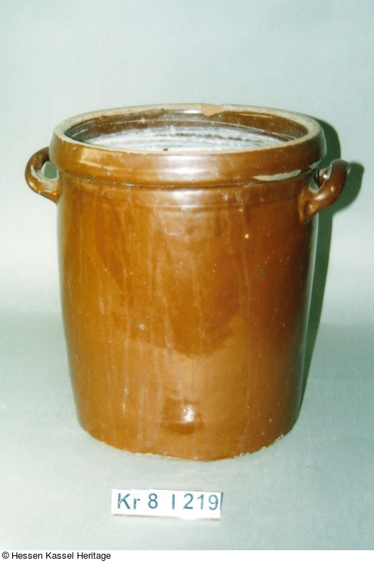 Gelblicher Scherben, innen und außen glasiert. Nach innen gewölbter Standboden mit exzentrischen Abschneidespuren. Konischer, nach oben leicht erweiterter Gefäßkörper mit breitem, leicht nach innen abgesenktem Wulstrand. Schulterständige, gegenständig horizontal stumpf angarnierte, nach oben gezogene Wulsthenkel. Henkel nicht vollständig glasiert. Glasur mit dunkelbrauner Farbwirkung. Auf Schulter umlaufend angedeutete Schmuckrille.