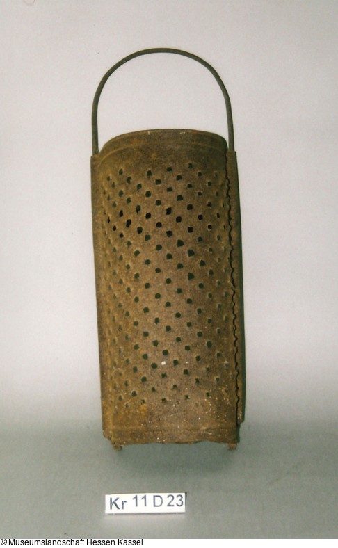 Rahmen aus Rundeisen, oben halbkreisförmig gebogen, unten flachgeschmiedet und zu Füßen gerollt. Reibefläche mit grober, gestanzter Lochung aus Blech halbkreisförmig nach oben gewölbt um Rundeisen geschlagen. Im oberen Bereich auf Rückseite eine Querstrebe zur Verstärkung.
