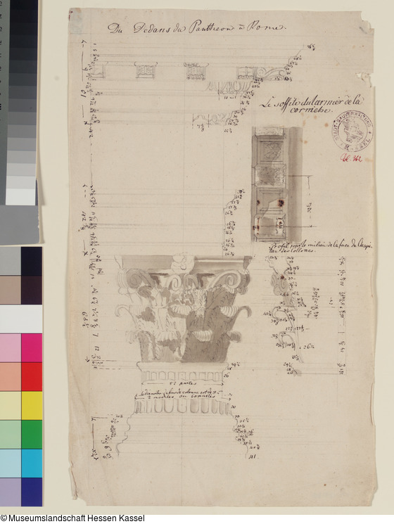 oben mittig und in der Darstellung: "Du Dedans du Pantheon à Rome.", "Le soffite du larmier de la corniche.", "Profil parte milieu de la face du Chapiteau des Collones." (mit Feder in Braun); rechter Rand: "Bl. 362" (mit Feder in Rot); in der Darstellung: (mit Feder in Braun);