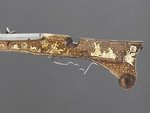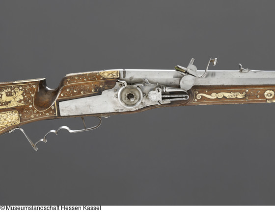 Die Kasseler Radschlossbüchse fällt vor allem durch die reichen Bein- und Geweiheinlegearbeiten auf. Während entlang des Laufes ein sich wiederholendes Dekor von phantastischen Tierwesen verläuft, zeigen die Einlegearbeiten auf beiden Seiten des Kolbens Szenen einer Bärenjagd und die bereits vertraute Szene einer Hirschjagd mit Hunden und hornblasendem Jäger mit Jagdspieß (vgl. etwa KP B XIV.92).